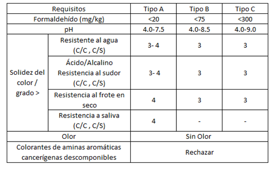 Las soluciones de Aseguramiento de Calidad Total de Intertek incluyen pruebas y experiencia integrales de GB para garantizar que sus productos textiles y de vestimenta cumplan con GB 18401-2010. La norma divide todos los productos textiles en tres categorías: productos infantiles, productos para contacto con la piel y productos sin contacto con la piel. Los productos se evalúan en comparación con los requisitos técnicos específicos que se enumeran en la siguiente tabla. Los productos para bebés deben cumplir con el requisito del Tipo A, los productos de contacto con la piel deben al menos cumplir con el Tipo B y el no contacto con la piel deben cumplir al menos el Tipo C. Todos los componentes que componen un producto para bebés deben cumplir con los requisitos técnicos del Tipo A, especificado en la tabla presentada a continuación. El componente con menos del 1% del peso total de productos no infantiles puede estar exento de pruebas.